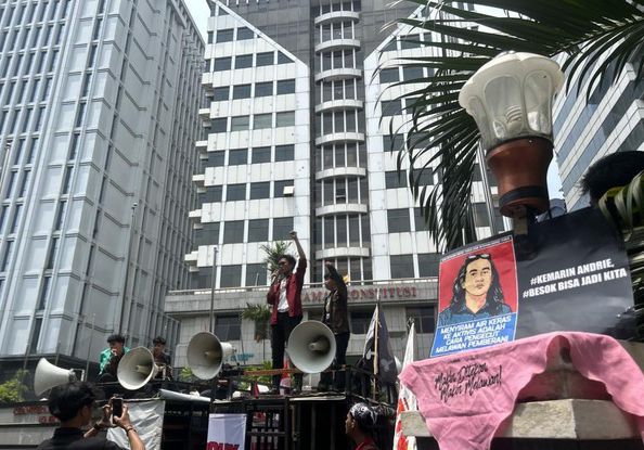 Sejumlah mahasiswa menggelar aksi unjuk rasa di sekitar gedung Mahkamah Konstitusi (MK), Jakarta Pusat, pada Rabu (9/4/2026). Aksi tersebut dilakukan sebagai bentuk tuntutan terhadap keadilan dan transparansi dalam penanganan kasus penyiraman air keras terhadap aktivis KontraS, Andrie Yunus.